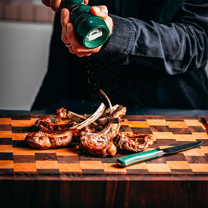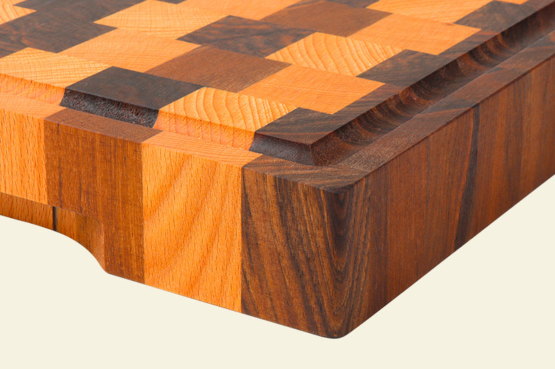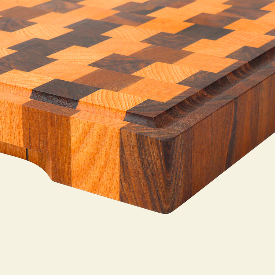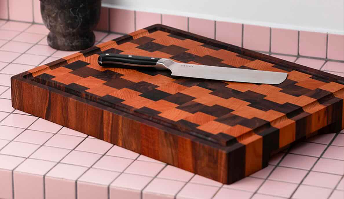 Wir haben gemeinsam mit der Werkstatt Chabret unseren eigenen Hackklotz entworfen. Nach zahlreichen Tests entschieden wir uns für einen Hirnholz-Hackklotz mit Schachbrettmuster aus zwei Holzarten: Buche und Nussbaum. Zwei perfekt harmonierende Farbtöne. Für das Design haben wir uns für quadratische Blöcke und eine versetzte Anordnung entschieden, um dem Hackklotz ein modernes Aussehen und eine moderne Struktur zu verleihen.