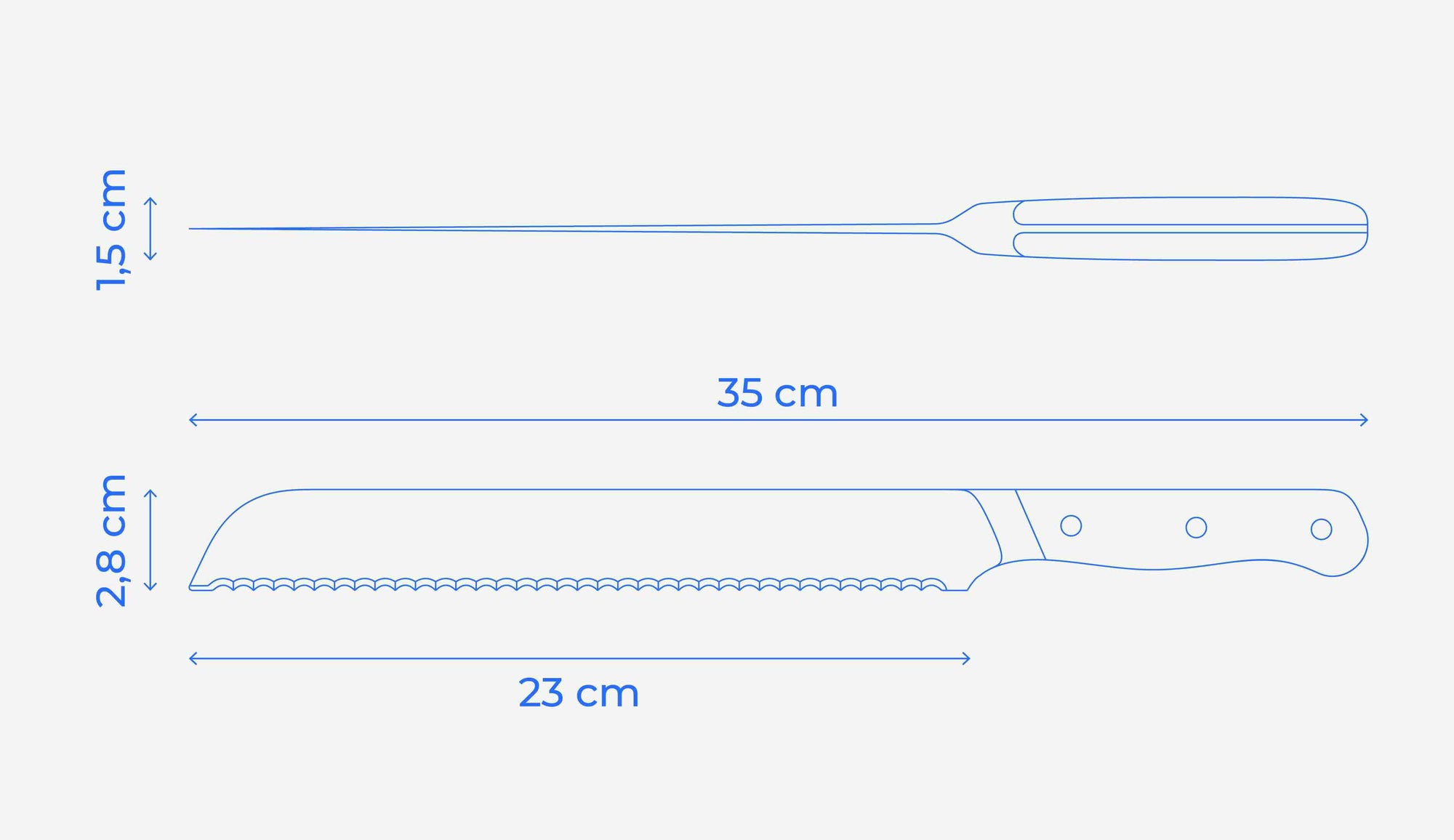 Seine 23 cm lange gezackte Klinge schneidet durch jedes Brot, ohne es zu zerdrücken.