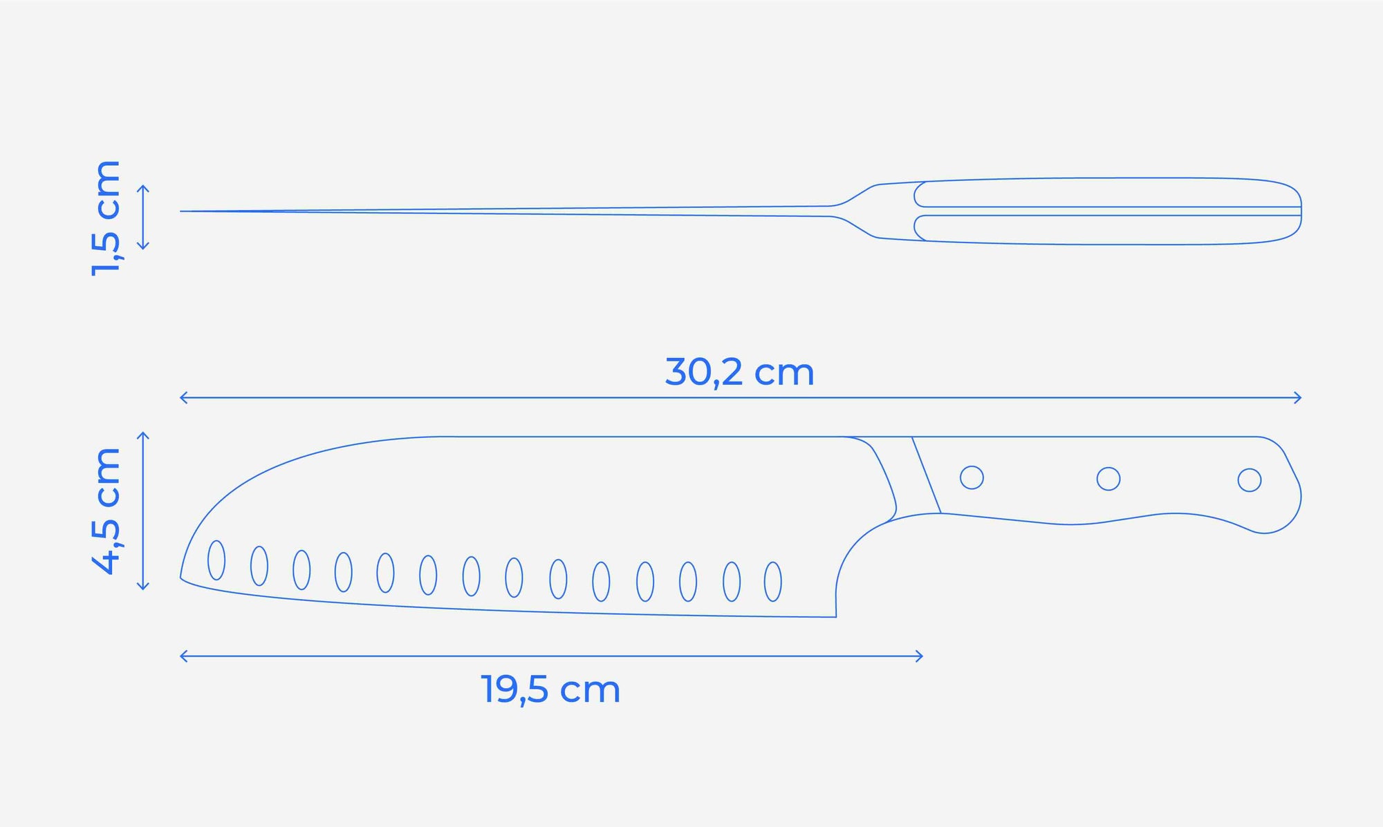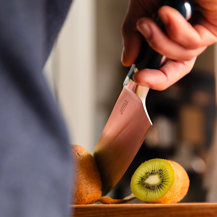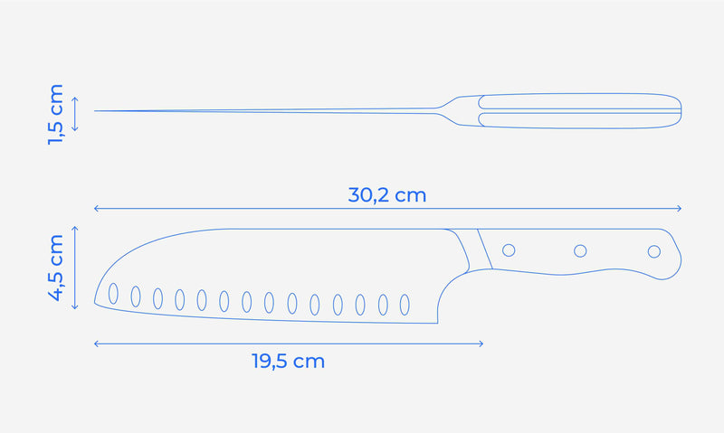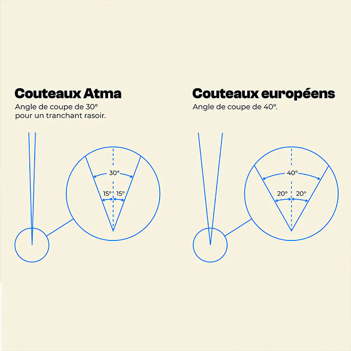 Wir haben uns für eine 58HRC-Stahlklinge entschieden – der perfekte Kompromiss aus Robustheit und Langlebigkeit. Der 30°-Winkel sorgt für sauberes und präzises Schneiden. Sie können Schnittlauch hacken, Ihr Sonntagshähnchen, ein Dorade-Carpaccio oder sogar einen Butternusskürbis tranchieren. Sie schonen Ihre Produkte und sparen viel Zeit.