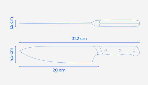 Ce couteau de chef a une lame de 20 cm de longueur et une longueur totale de 31,2 cm avec le manche.