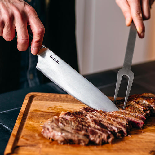 Ein solides Messer ist gut, aber ein Messer, das angenehm zu handhaben ist, ist etwas ganz anderes. Um dies zu erreichen, haben wir uns für einen geneigten Kropf entschieden, der auf der Klinge aufliegt. Das ist nicht nur sicherer für Ihre Hände, sondern erleichtert auch das Schneiden. Wir garantieren Ihnen, dass Sie beim Kochen viel mehr Freude haben werden!