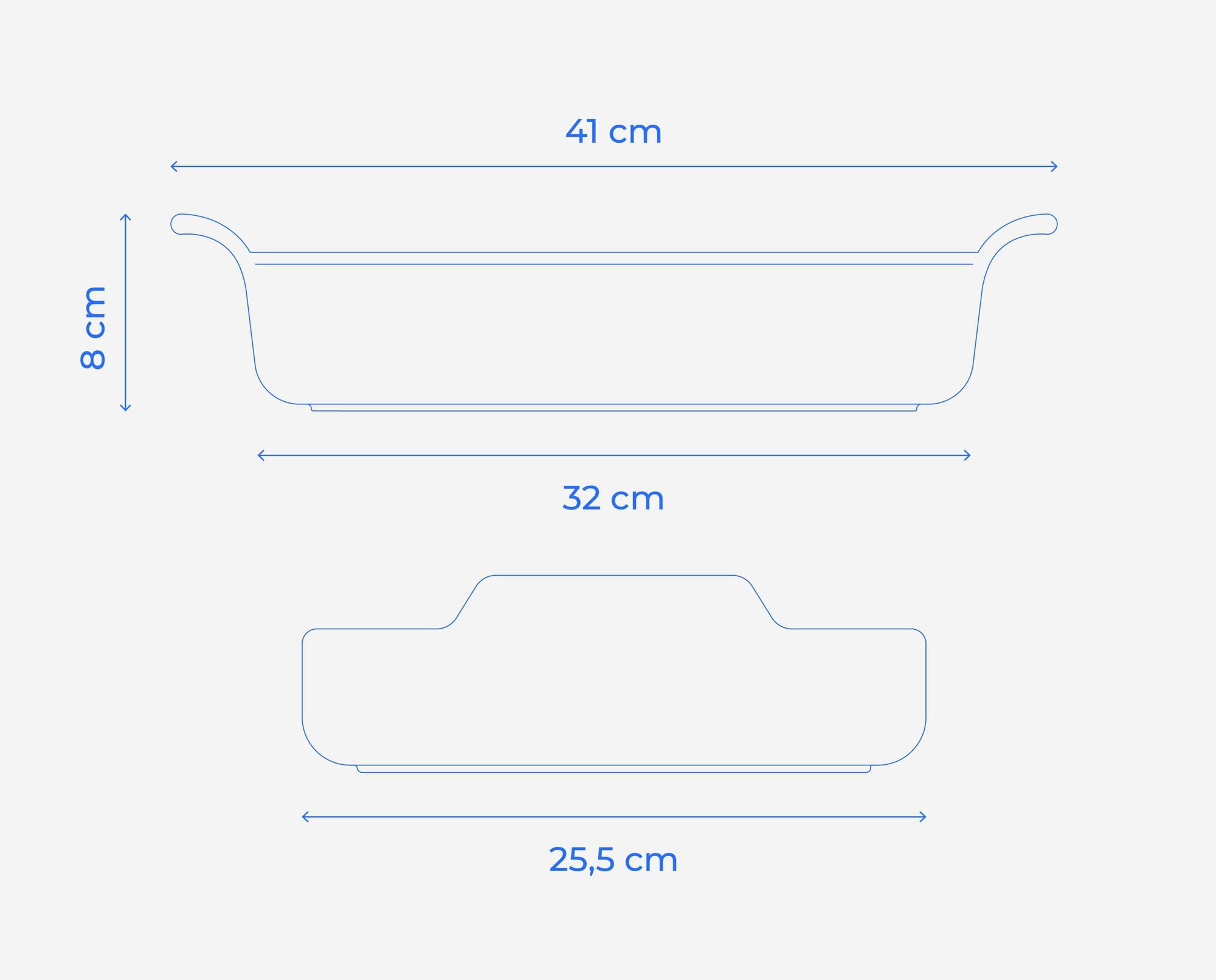 Il mesure 8 cm de hauteur, 32 cm de surface de cuisson et 41 cm de longueur totale avec les poignées.