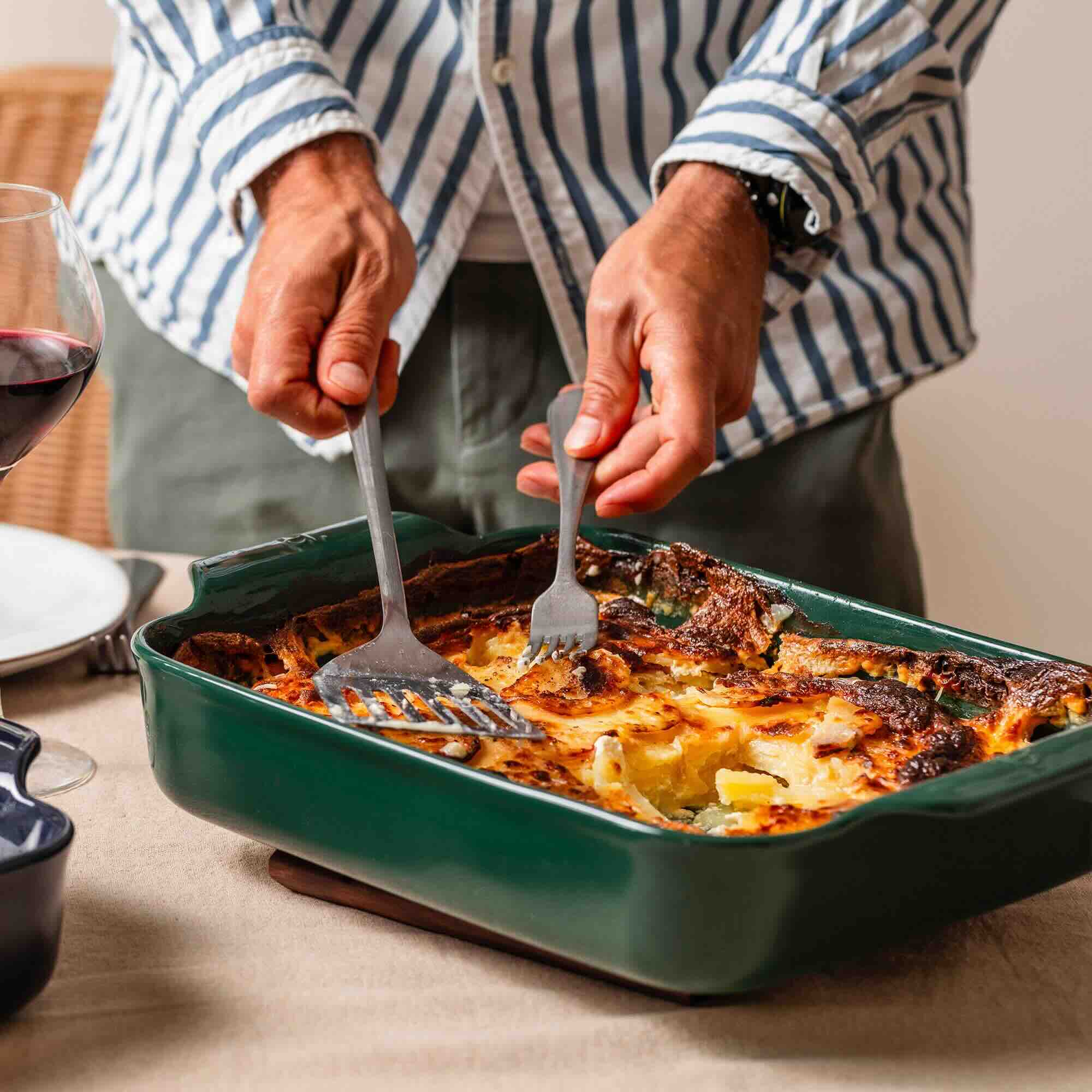 Wir haben diese Auflaufform gemeinsam mit Ihnen entworfen. Wie immer haben wir Sie nach Ihrer Meinung gefragt, und über 1.200 von Ihnen haben uns Ihre Erwartungen mitgeteilt. Deshalb haben wir jede Ihrer Antworten analysiert, um die perfekte Auflaufform für Sie zu finden. Keramik oder Glas: Sie haben sich für Keramik entschieden. Das Format? Rechteckig, ganz nach Ihren Wünschen. Bei den Farben hatten Sie die Wahl zwischen Olivgrün und einem schönen Mitternachtsblau. Deshalb haben wir uns entschieden, Ihnen diese beiden zeitlosen Farben anzubieten.