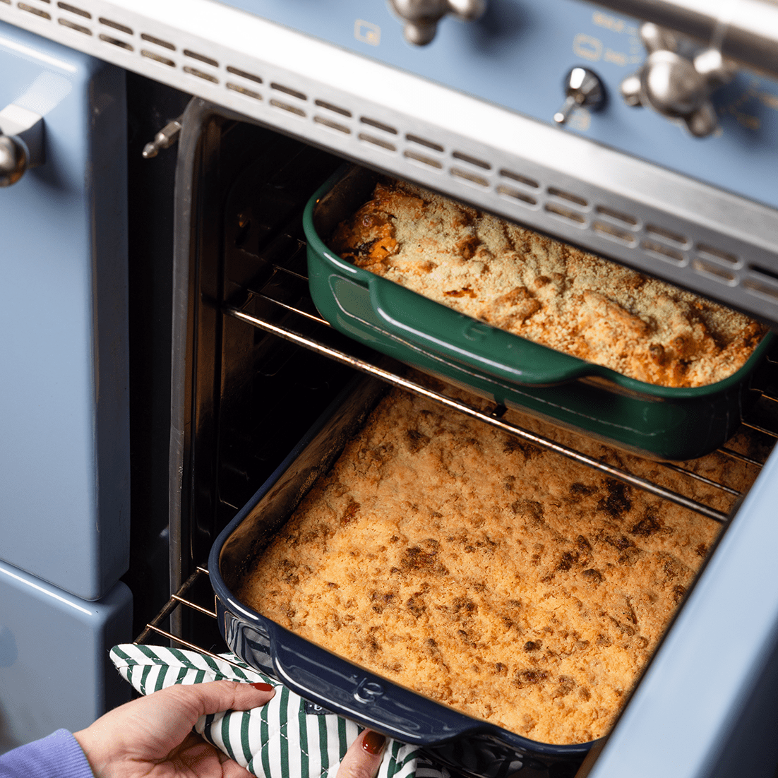 Wir haben mit unserem französischen Designer Marc Venot zusammengearbeitet, um eine elegante, praktische und zeitlose Auflaufform zu entwerfen. Eine, die uns trotz der Zeit immer wieder begeistert. Wir besuchten mehrere Fabriken und erstellten Dutzende von Prototypen, bevor wir die perfekte Auflaufform, getreu Marcs Design, gefunden haben. Und ja, der Teufel steckt im Detail: Das subtile Relief, das wir uns um die Griffe herum vorgestellt hatten, war aufgrund des handwerklichen Herstellungsprozesses letztendlich sehr kompliziert umzusetzen. Für die Farben mussten wir rund zehn Tests durchführen, bis wir das perfekte Olivgrün und dieses tiefe Mitternachtsblau fanden, die jeden Ihrer Tische verschönern werden. Wie Sie sehen, haben wir ein wunderschönes und effizientes Design geschaffen, mit dem Sie Ihre Gäste mit Komplimenten überhäufen werden.