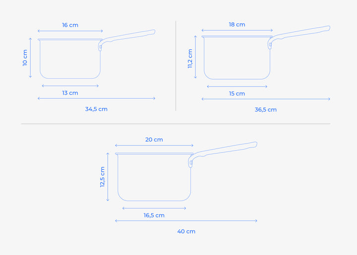 - Enthält Töpfe mit einem Durchmesser von 16, 18 und 20 cm.