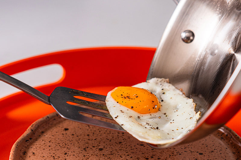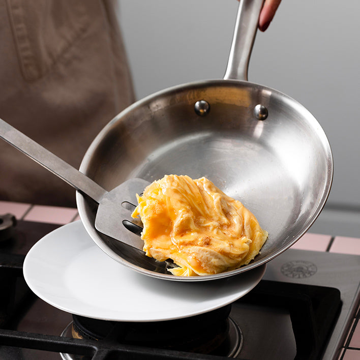 Um das Beste aus eurer Edelstahlpfanne herauszuholen, haben wir auf unserem Blog zahlreiche Tipps für erfolgreiches Kochen mit Edelstahl für euch gesammelt. Falls euch beim Lesen die Augen zufallen, könnt ihr auch einfach die Schritt-für-Schritt-Tutorials auf unserem Youtube-Kanal anschauen. Außerdem wartet in eurem Paket eine umfangreiche Kochanleitung darauf, aufgeschlagen zu werden. Unser Rat in Kurzform: Pfanne auf mittlere Hitze für 2 Minuten vorheizen, den Wassertropfentest machen und dann bei allen Gerichten – außer Fleisch, das klappt auch ohne – hochwertiges Öl oder Butter dazugeben. Und lasst die Finger von hoher Hitze. Dank der 3-lagigen Technologie ist es überflüssig, eurer Pfanne ordentlich einzuheizen. Mehr braucht ihr für den Anfang nicht zu wissen.