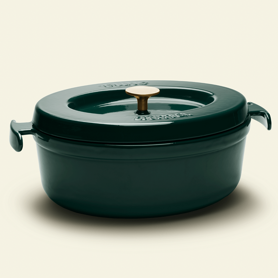 Wir sind zurück zu den Wurzeln gegangen: robustes Gusseisen, das die Hitze wie kein anderes Material speichert und verteilt. Es bräunt wunderbar, gart langsam und gleichmäßig und bewahrt alle Aromen. Die Feuchtigkeit kann nicht entweichen, was zu volleren, reichhaltigeren Ergebnissen führt. Der solide emaillierte Boden verträgt hohe Hitze und ist kratzfest. ihr könnt ihn direkt vom Herd in den Ofen und wieder zurück stellen, ganz ohne Probleme. Dreht die Hitze hoch, um zu reduzieren – dafür ist er gedacht. Er ist frei von PFAS, Cadmium, Chrom und Kobalt und somit ungiftig.
