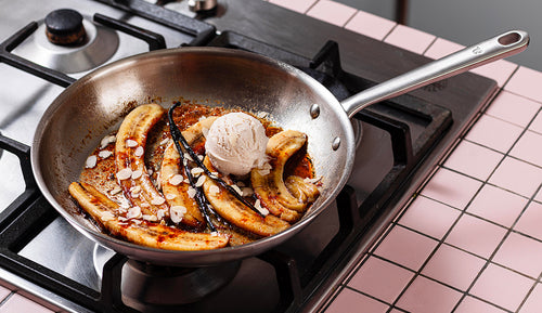 - Für alle eure Gerichte – mit Ausnahme von Fleisch – gilt: Ein Spritzer Öl oder Butter gehört immer in die Pfanne. Warum? Dank der optimalen Hitzeverteilung unserer Edelstahlpfannen gelingen Steak & Co auch ganz ohne weitere Hilfe.