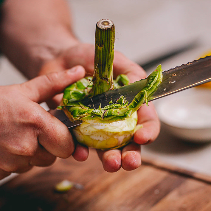 Wir haben uns für eine 58HRC-Stahlklinge entschieden – der perfekte Kompromiss aus Robustheit und Langlebigkeit. Der 30°-Winkel sorgt für sauberes und präzises Schneiden. Sie können Schnittlauch hacken, Ihr Sonntagshähnchen, ein Dorade-Carpaccio oder sogar einen Butternusskürbis tranchieren. Sie schonen Ihre Produkte und sparen viel Zeit.